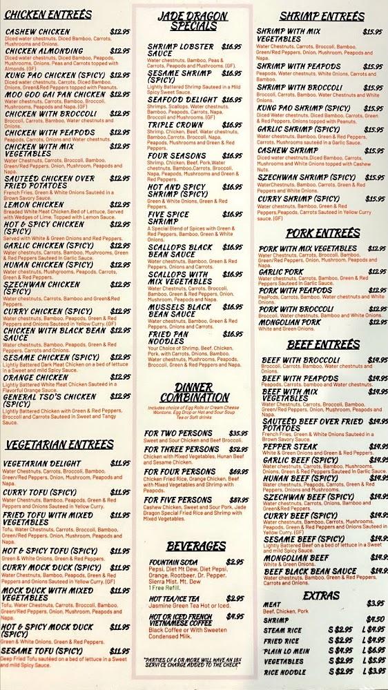 Vegetarians find excellent choices with dishes like Curry Tofu and Fried Tofu with Mixed Vegetables. There’s something for everyone, from hearty entrees to light appetizers. The menu is diverse, with over 145 items spanning various culinary styles, ensuring each visit can be a new experience. Favorites like the Jade Dragon Specials, including Sesame Shrimp, highlight the chef's creativity and skill.